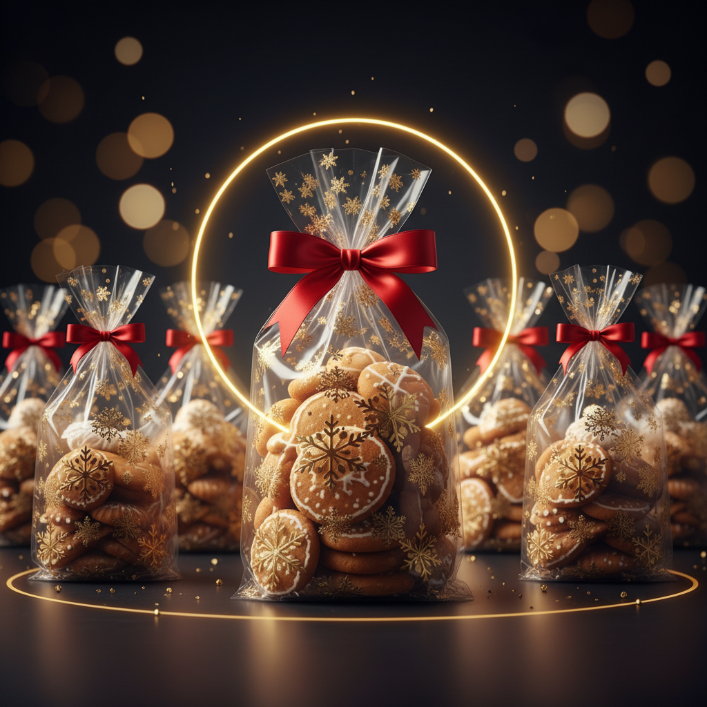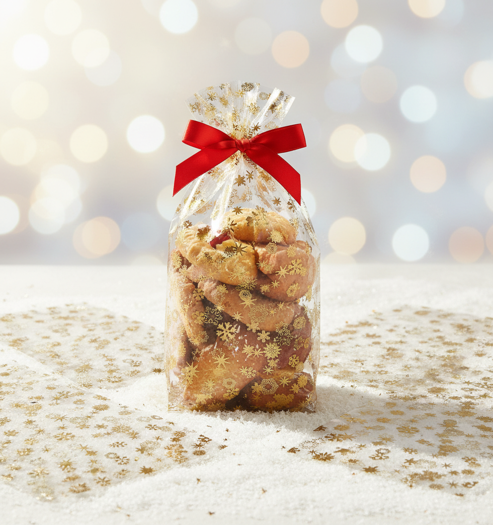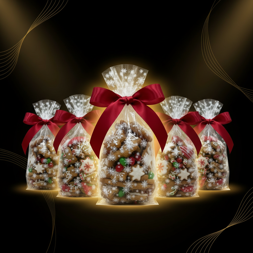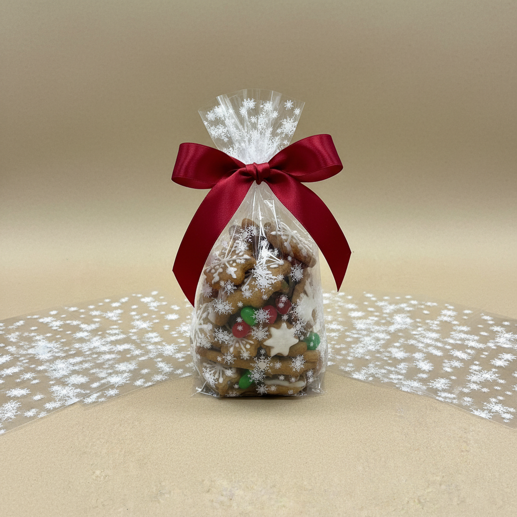 Pakenda oma maiused stiilselt! Need läbipaistvad valgete lumehelveste ja jääkristallidega kinkekotid sobivad ideaalselt kommide, küpsiste, koogikeste, trühvlite ja väikeste kingituste kauniks esitlemiseks. Lihtne täita ja sulgeda – suurepärane valik nii koduseks kasutamiseks kui ka väikeettevõtte toodete jaoks.