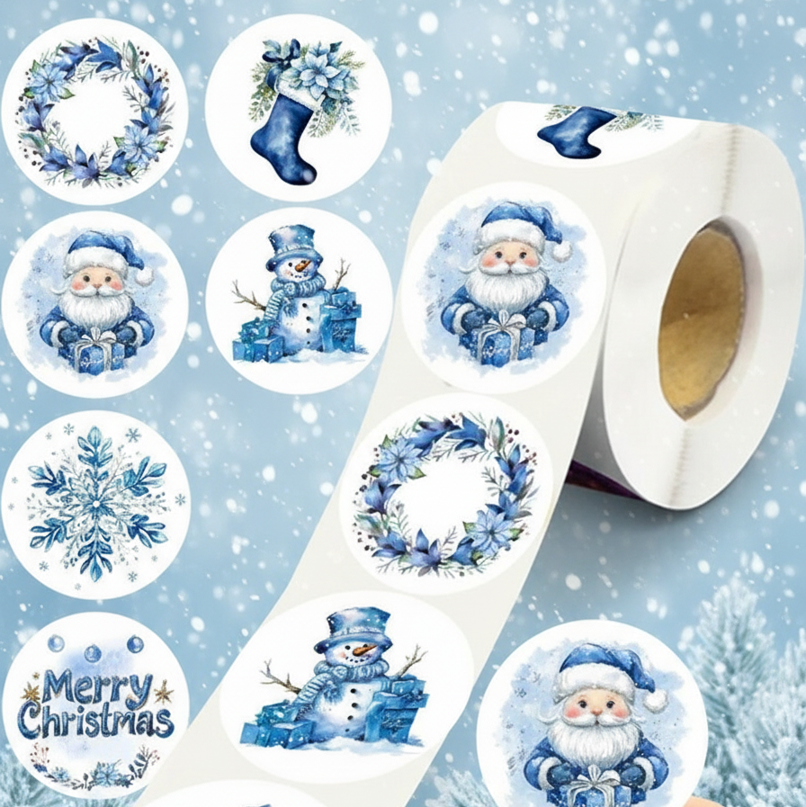 See kaunite sinistes toonides jõulukleepsude rull sisaldab mitmeid talviseid ja pidulikke kujundusi: armsad sinised jõuluvanad, lumememmed, kingikotid, lillepärjad, lumehelbed, kuusemotiivid ning “Merry Christmas” tekst. Ideaalne kingituste, küpsisekarpide, kinkekottide, ümbrike ja advendikalendrite kaunistamiseks.