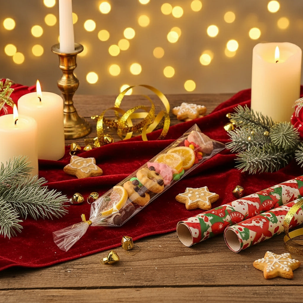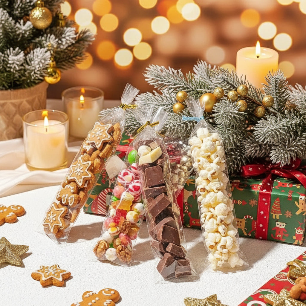 Paki maiustused ja kingitused läbipaistva tsellofaankoti abil, mis on varustatud elegantsete kuldsete keerdsidemetega.