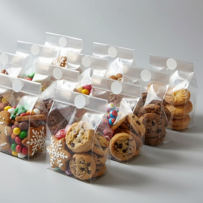 Läbipaistvad pakke-kotikesed kandilse laiema põhjaga mõõtudega 90*200*40mm.