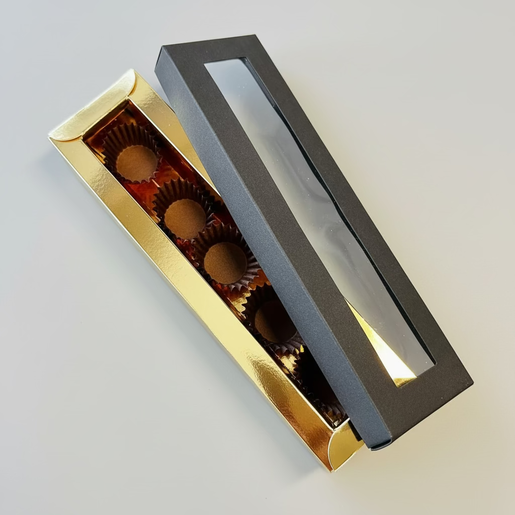 See kuldne trühvlikarp on varustatud läbipaistva aknaga, mis võimaldab sisu esitleda stiilselt ja kutsuvalt.
