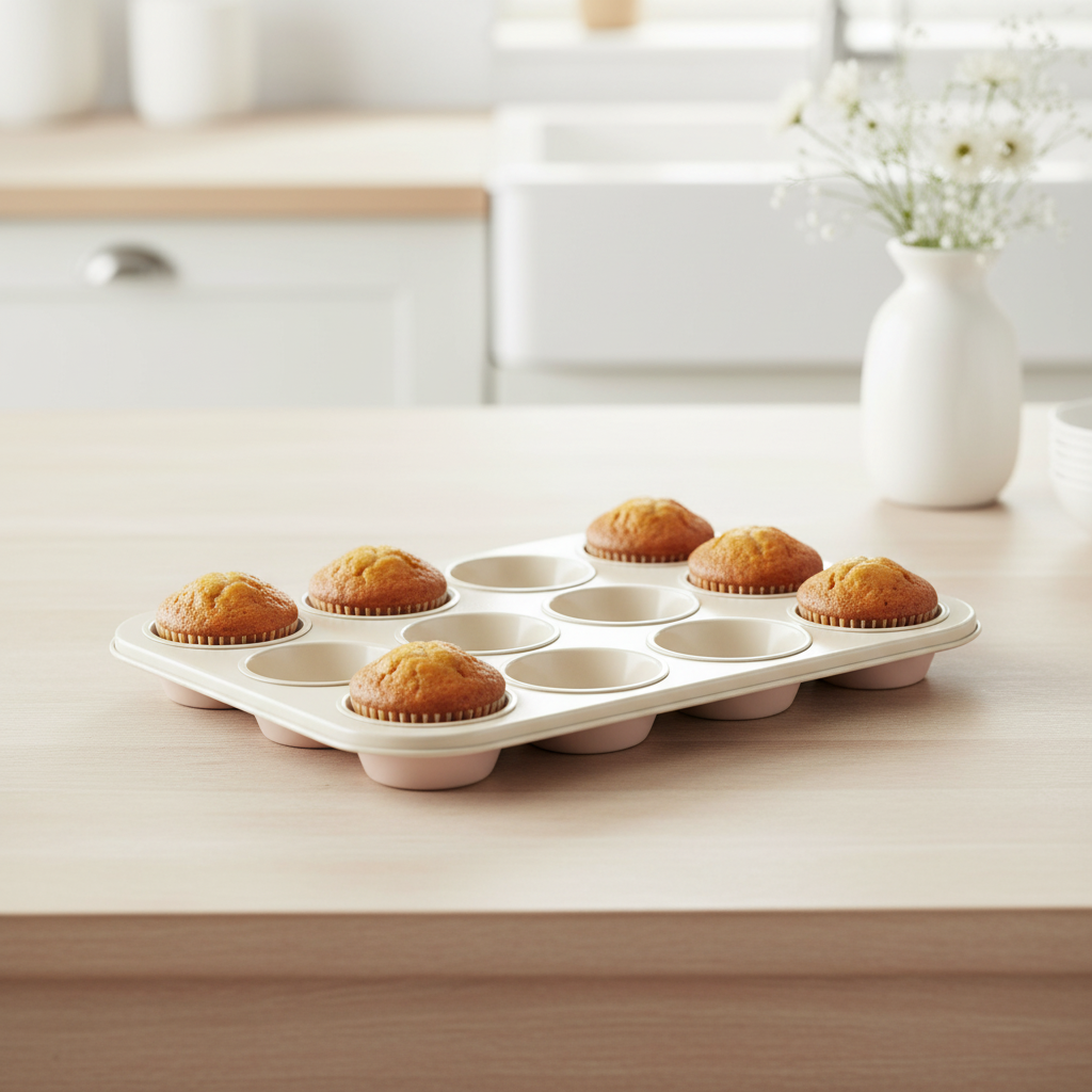 Muffinivorm on valmistatud kvaliteetsest terasest (teras 0,5 mm), mis jaotab kuumuse ühtlaselt. Kahekordne keraamiline mittenakkuv kate aitab küpsetised hõlpsalt vormist kätte saada ning muudab puhastamise lihtsaks.