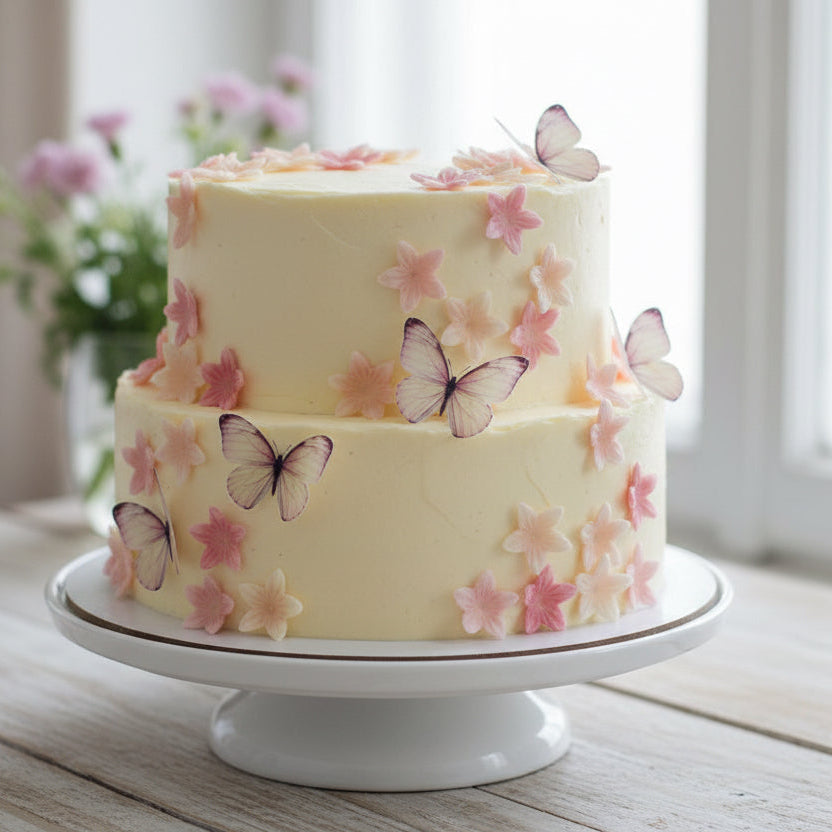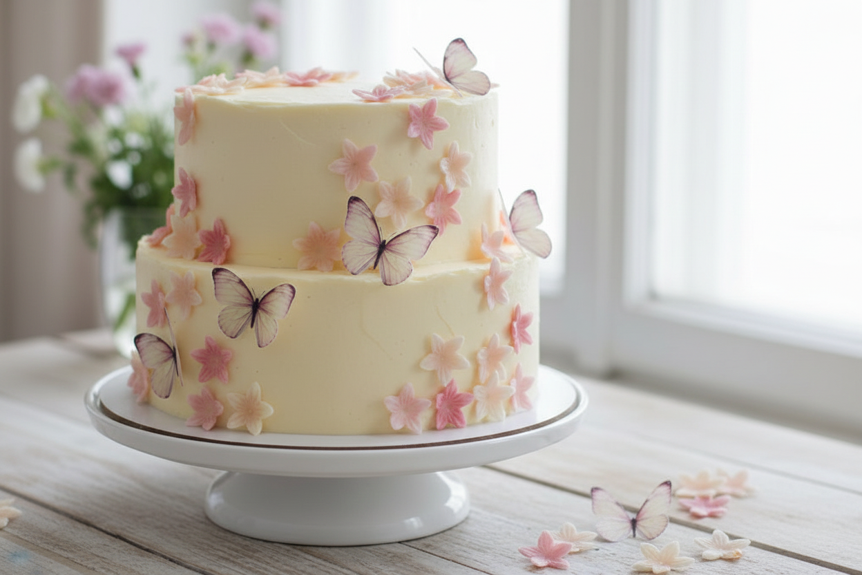 Õhukesest vahvlist valmistatud lilled ja liblikad mõjuvad elegantselt ning loovad küpsetisel kauni efekti.