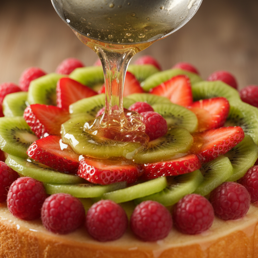 Close-up macro shot of fresh fruit (strawberries, kiwi, raspberries) on top of a cake. A glossy transparent glaze is being poured slowly over the fruit, creating a shiny, appetizing finish.