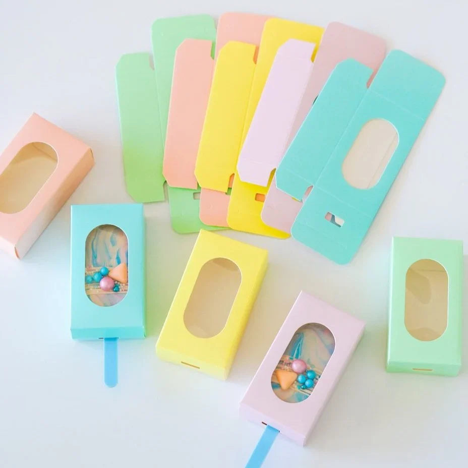 Stiilsed ja praktilised cakesicle-karbid, mis on ideaalsed minikookide, pulgakookide ja maiustuste pakkimiseks ja esitlemiseks.