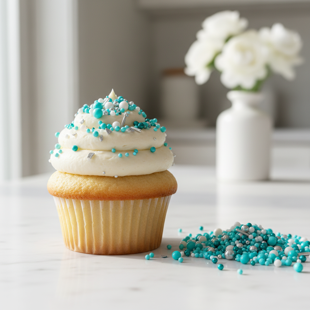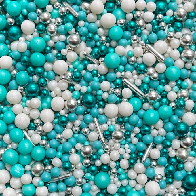 Segu sisaldab türkiissiniseid suhkrupärleid ja dekoratiivseid helbeid, mis muudavad tortide, tassikookide, küpsiste ja piparkookide pinnad hetkega silmapaistvaks.