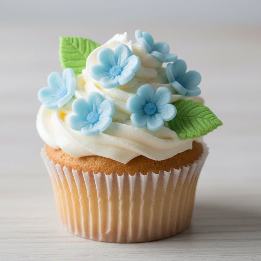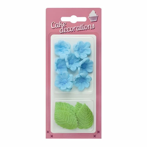 Komplekt sisaldab erineva kujuga siniseid lilli ning rohelisi lehti — ideaalne nii romantiliste kui ka minimalistlike tortide, tassikookide ja teiste magustoitude dekoreerimiseks.