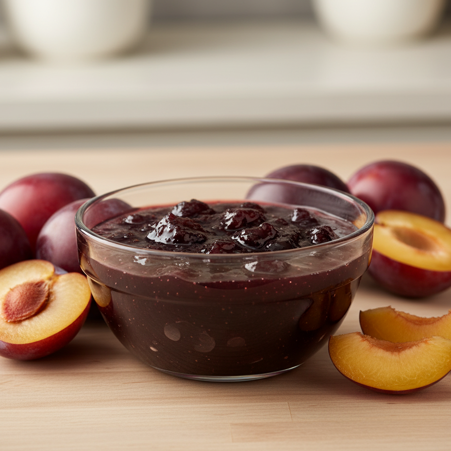 🧾 Koostisosad: ploom (60%), suhkur, glükoosifruktoosisiirup, vesi, modifitseeritud tärklis, paksendaja (gellan kumm), toiduvärv: (betaniin), happesuse regulaator (sidrunhape), naturaalsed lõhna- ja maitseained, säilitusaine (kaaliumsorbaat).
