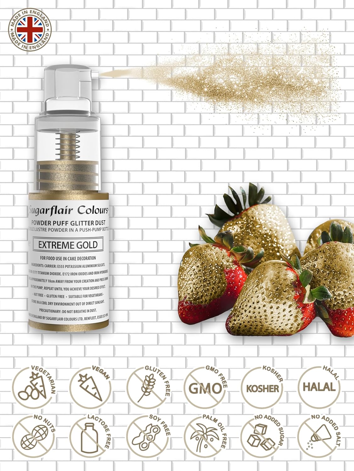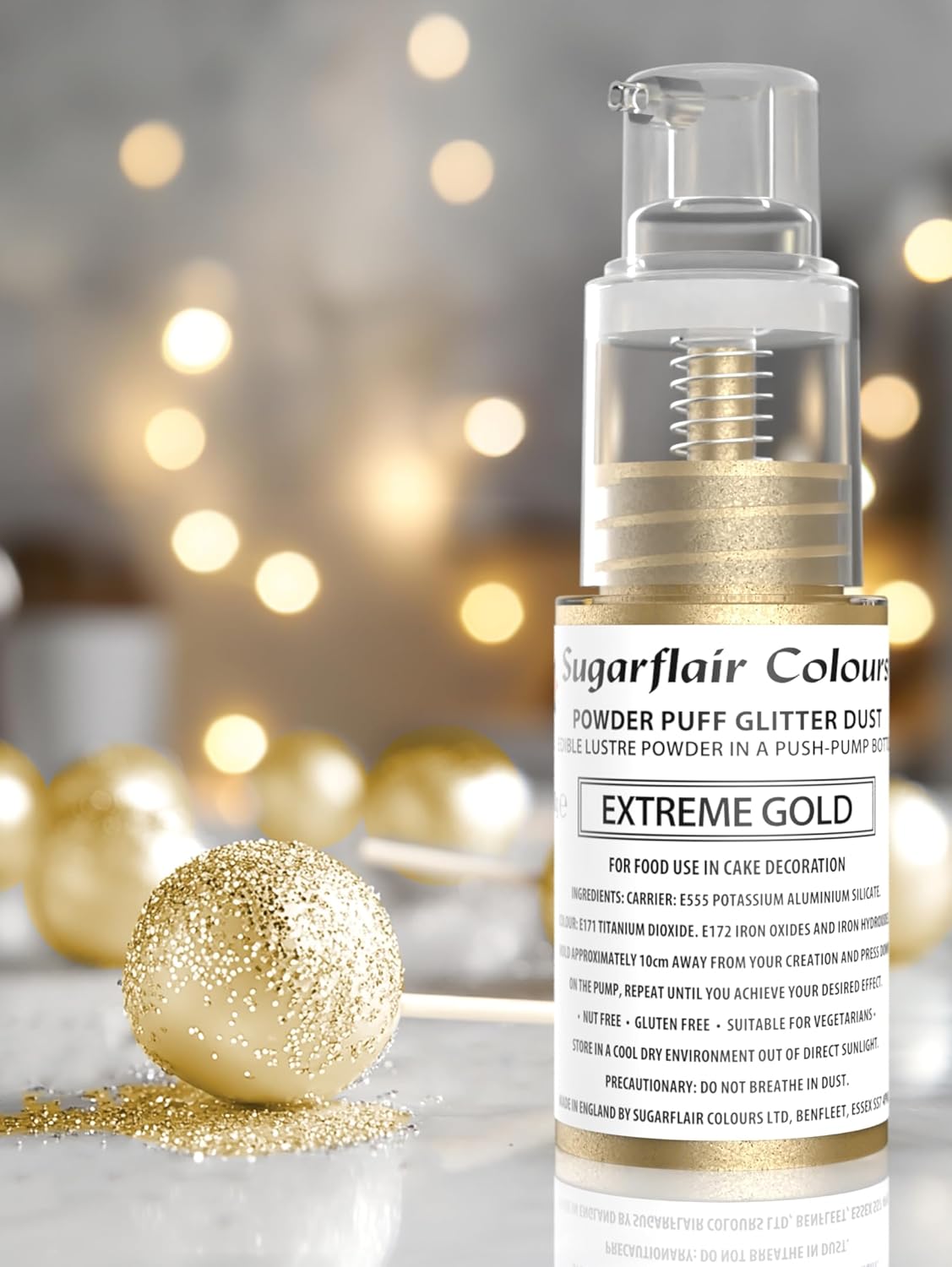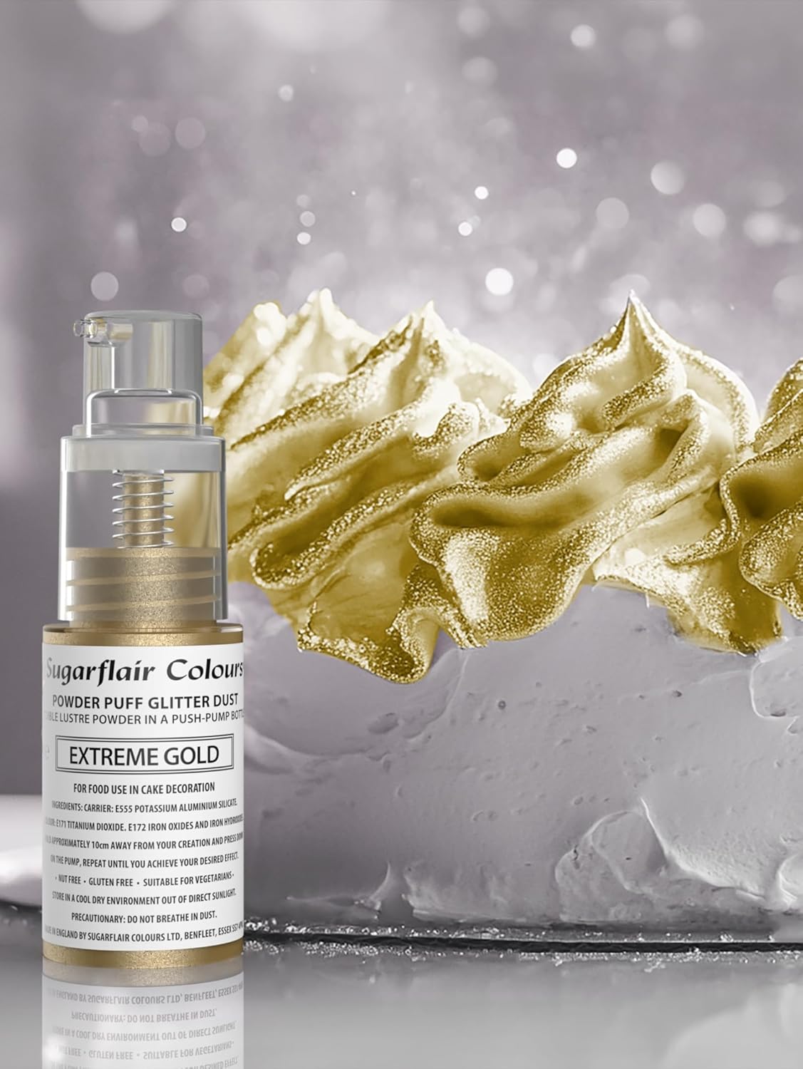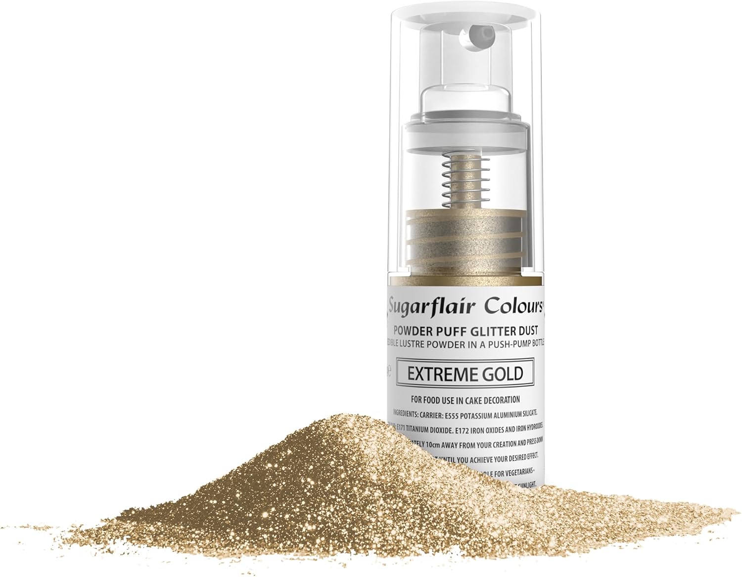 Sädelev pulbervärv pihustina - eriti mugav kasutada tortide, kookide, dessertide jm dekooride kaunistamiseks.