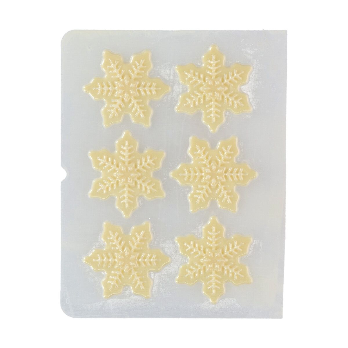 FC Šokolaadist kaunistused – Lumehelbed 6 tk — valmistatud ehtsast Belgia valgest šokolaadist ning detailse kujundusega, mis toob välja nii visuaalse ilu kui ka maitseelamuse.